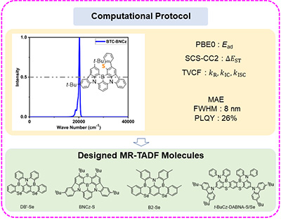 Congratulations to Dr Rongrong Li for the new paper accepted for publication in JCP! Full width at half maximum (FWHM) is an important indicator for color purity in molecular optical emission. In addition, brightness is determined by photoluminescence quantum efficiency (PLQY). Thermally activated delayed fluorescence (TADF) can convert the electro-pumped triplet states into emissive singlets. Especially, recent experiments suggest that multiple resonance TADF molecules doped with heavy atoms S/Se could effectively avoid the efficiency roll-off by promoting the reverse intersystem crossing (RISC) process. We propose a computational protocol to evaluate FWHM and PLQY based on quantum chemistry calculations and thermal vibration correlation function formalism, which is of great potential to design highly efficient and color-pure molecules. We further build a robust correlation between the reorganization energy of emission state λemS1S0 with FWHM and the inverse of reorganization energy of the intersystem crossing (ISC) process 1/λS1T1 with experimental reverse ISC rate constant kexpRISC, crucial for TADF. Our computational method and findings can be used for the molecular design of organic light-emitting diode materials. |